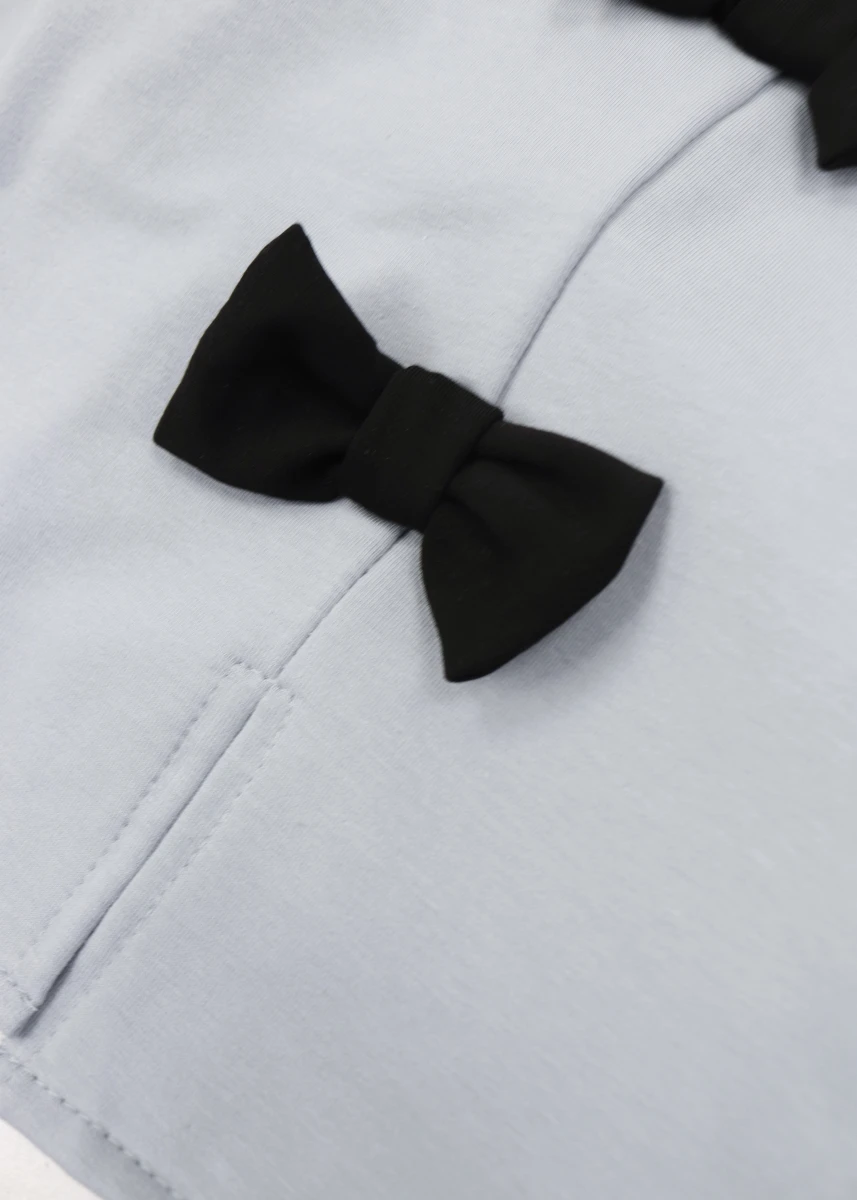 Производитель: Украина. Сезон: деми. Состав: 75% хлопок, 20% полиэстер, 5% лайкра. Однотонная. Круглая горловина. Рукава на манжете. Сзади удлиненная и посередине разрез. Декорированная сзади нашитыми бантиками.