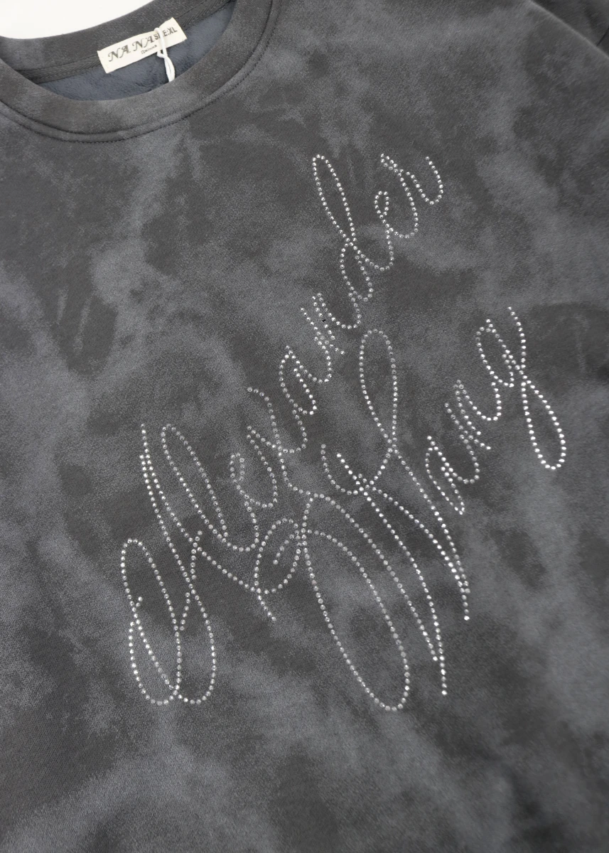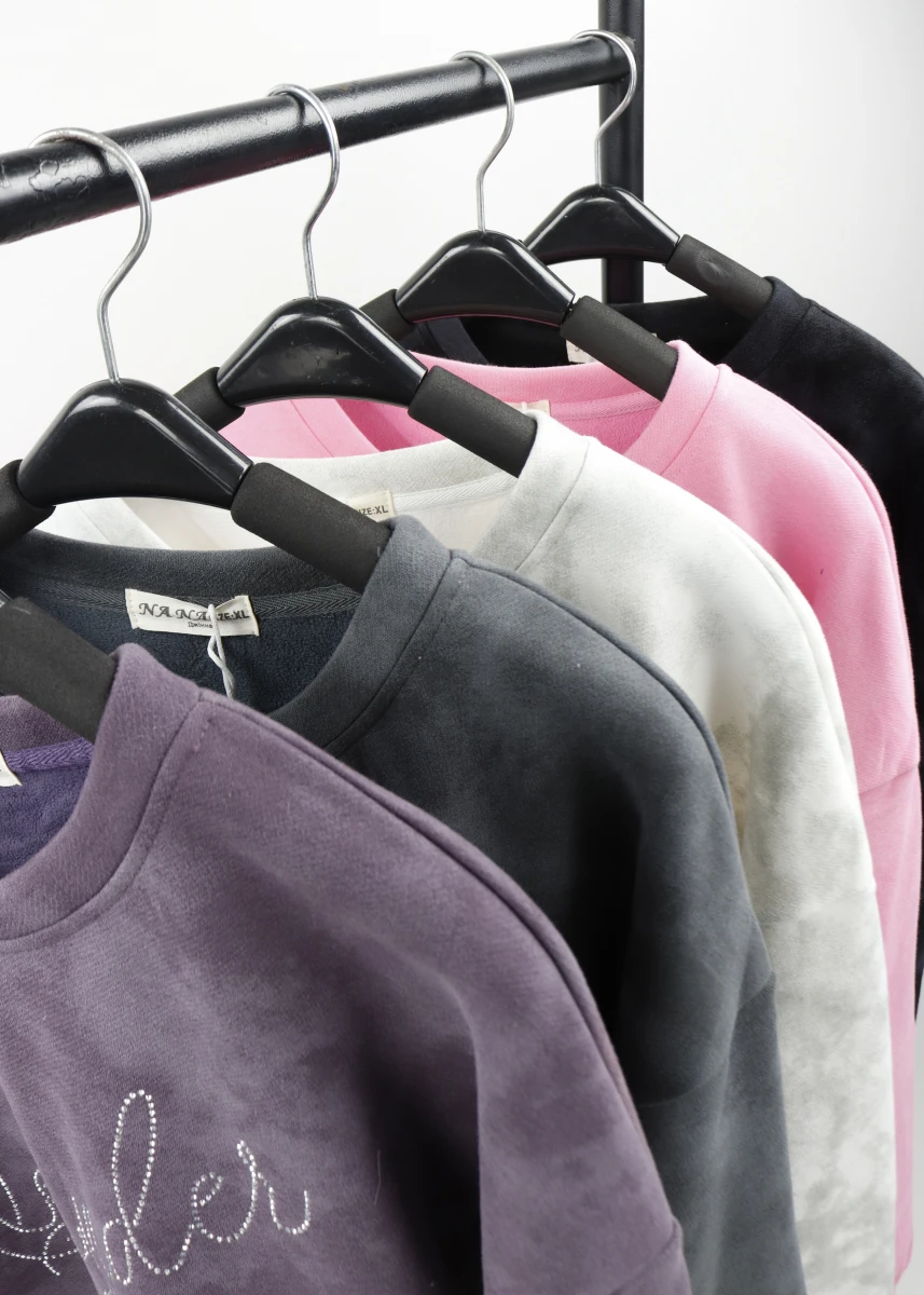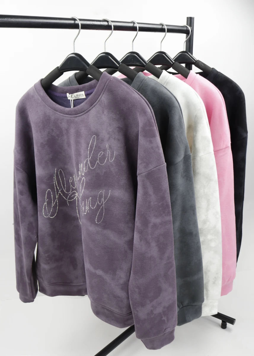 Производитель Китай. Сезон зимы. Круглая горловина. На рукавах и снизу манжеты. Впереди на груди надпись камешками.