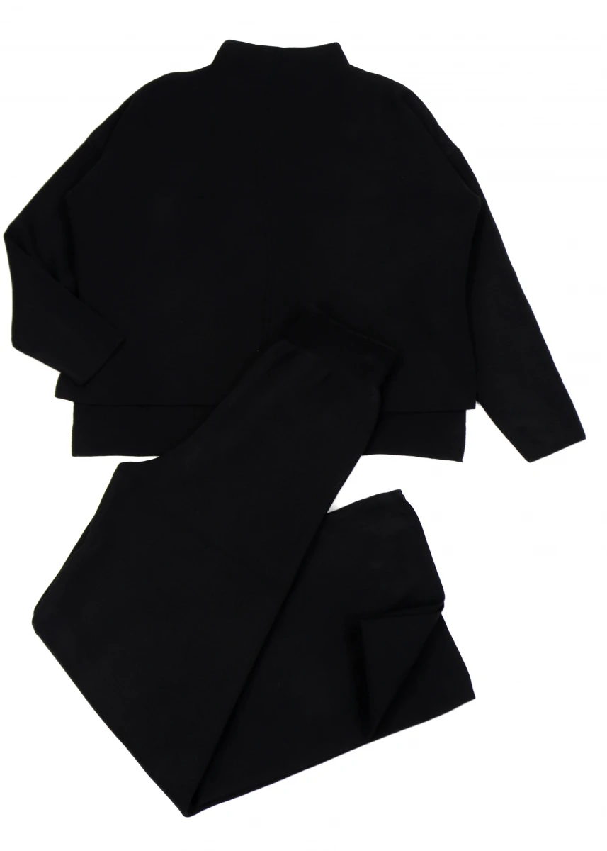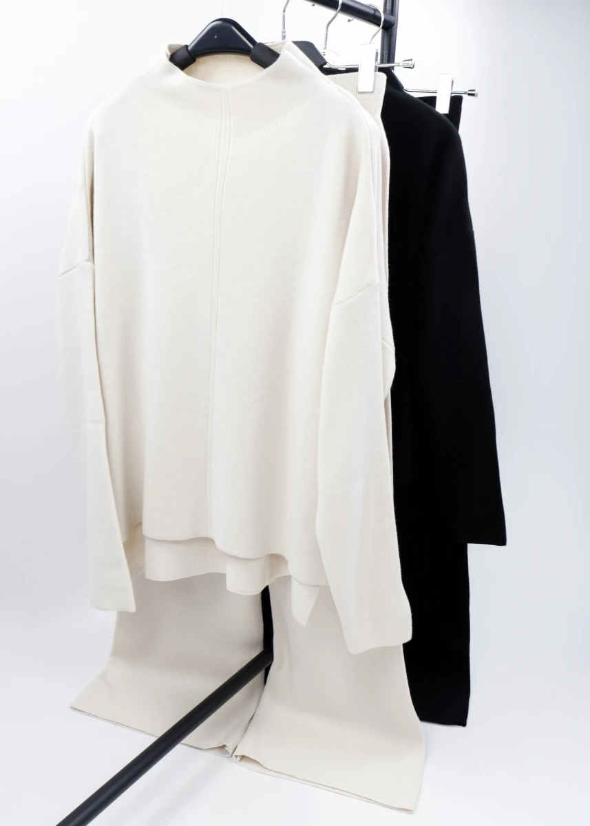 Однотонный. Кофта +штаны. Кофта: горловина стойкой обрезной, на передней части от шеи донизу две полосы с углублением.