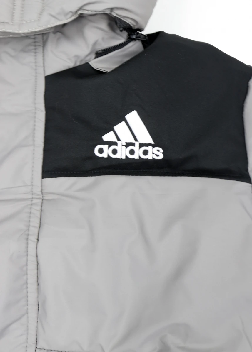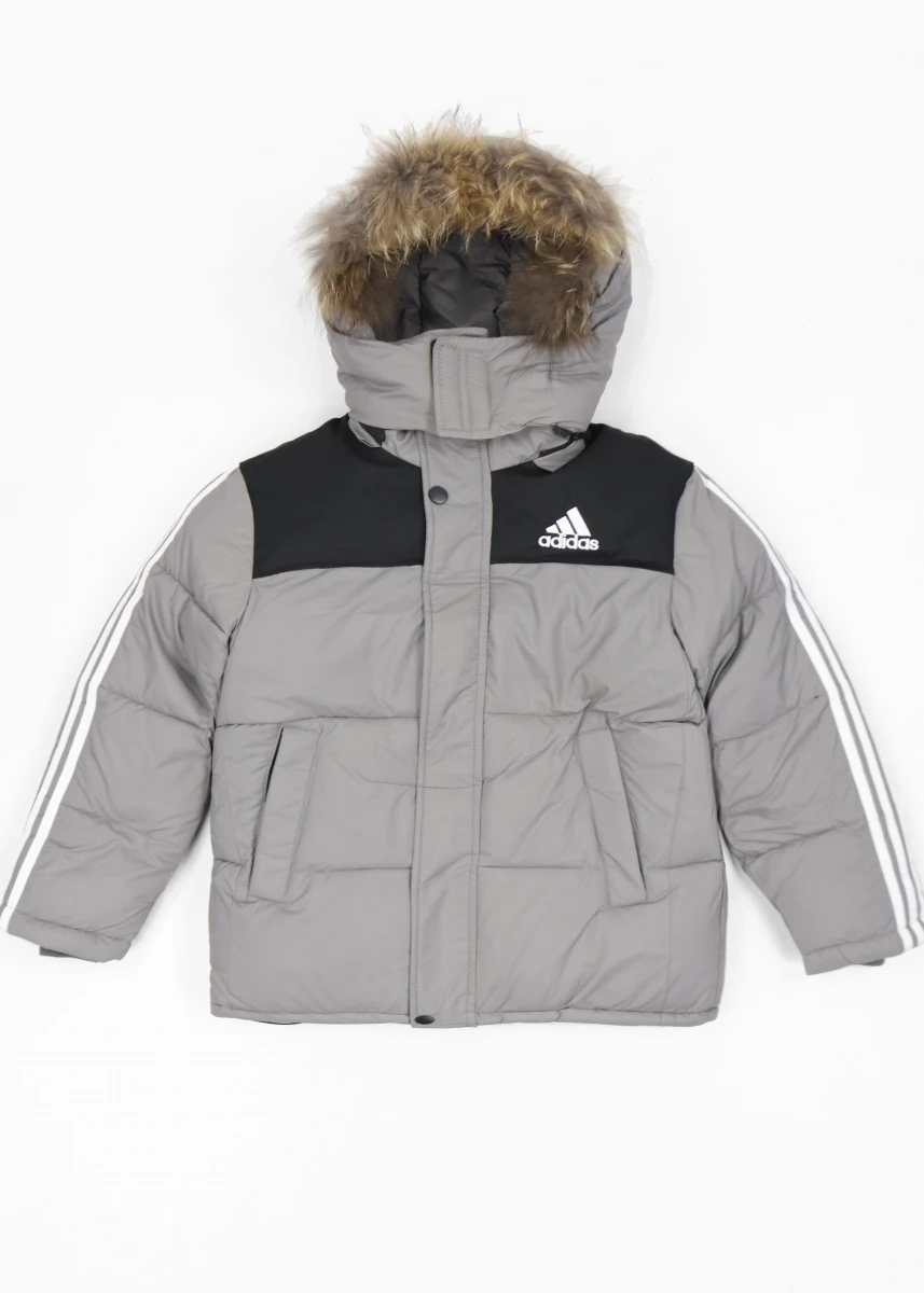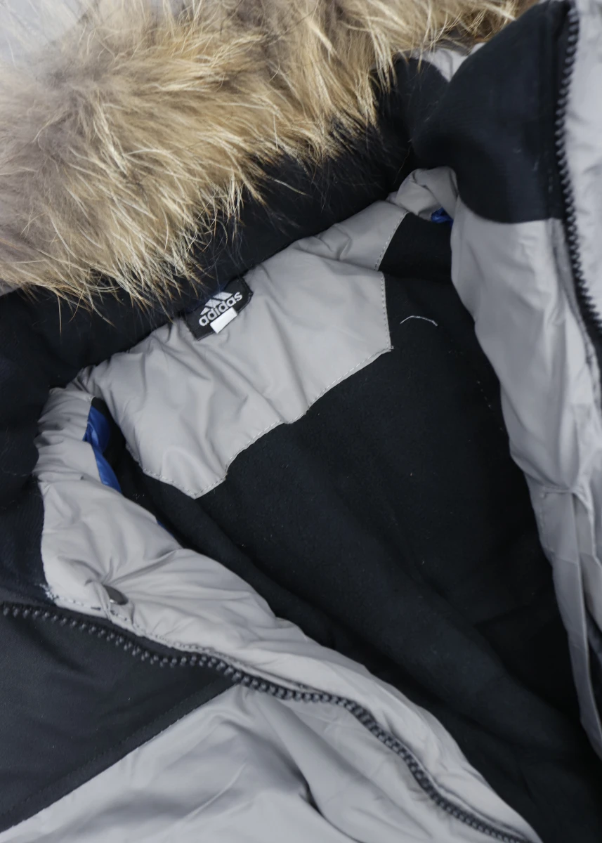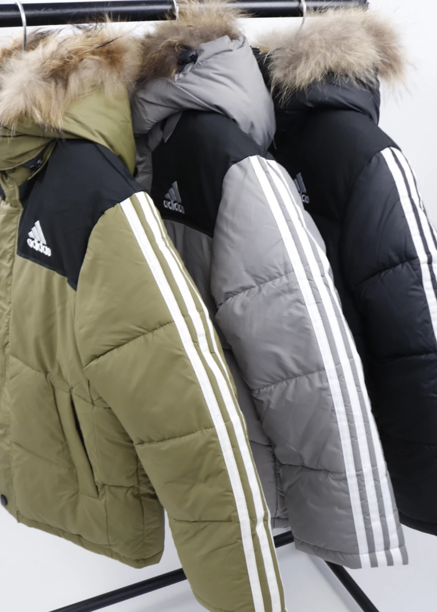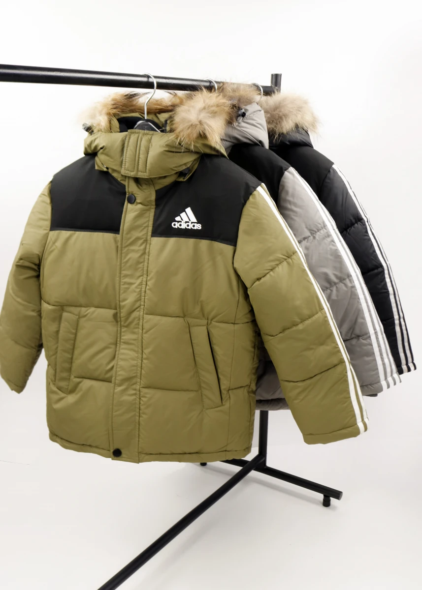 Производитель Китай. Сезон зима. Отстегивающийся капюшон с мехом. С левой стороны на груди вышивка логотипа "Adidas". В середине флисовая подкладка. На рукавах полосы бренда.