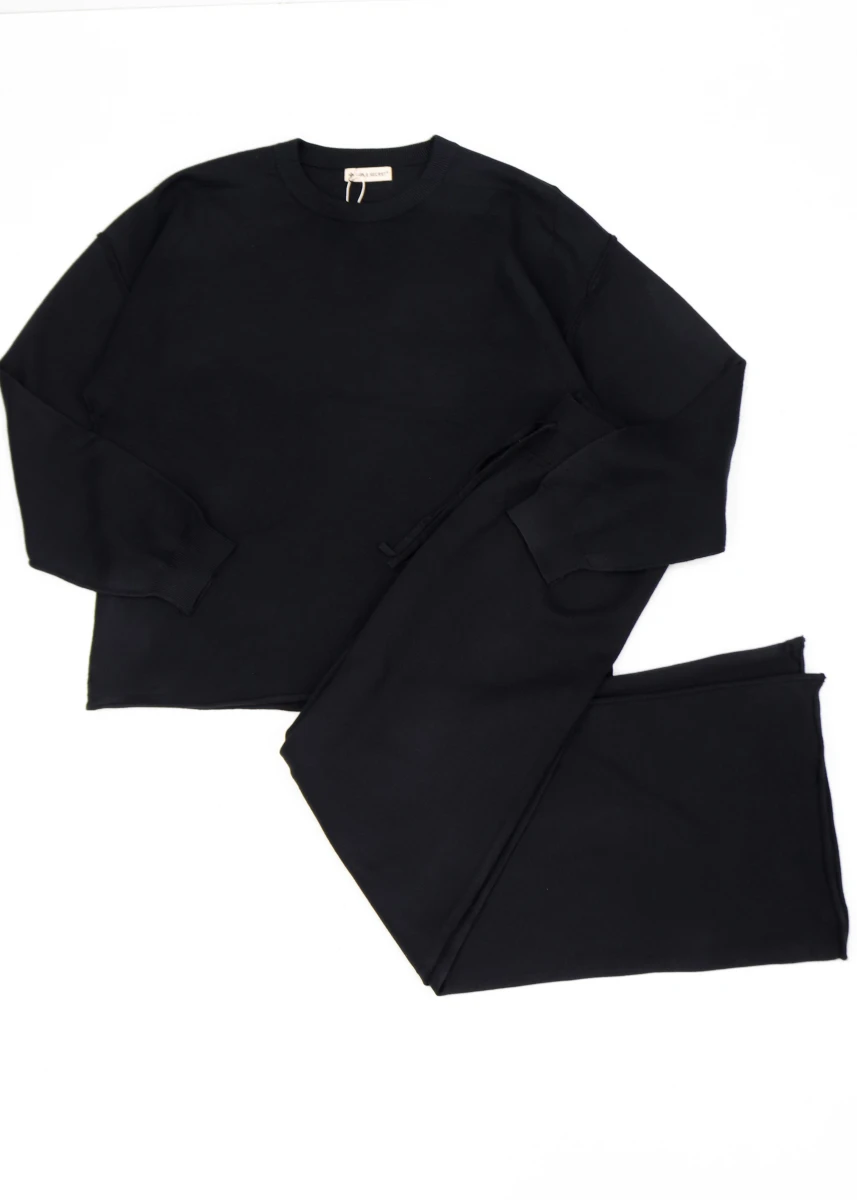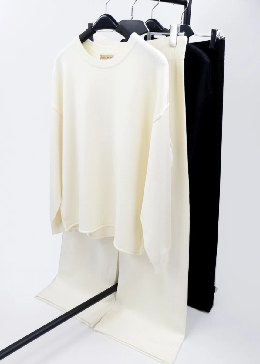 Однотонный. Мелкая вязка. Кофта+штаны. Кофта: круглая горловина, швы прошиты наизнанку. Брюки: пояс резинкой со шнуровками.
