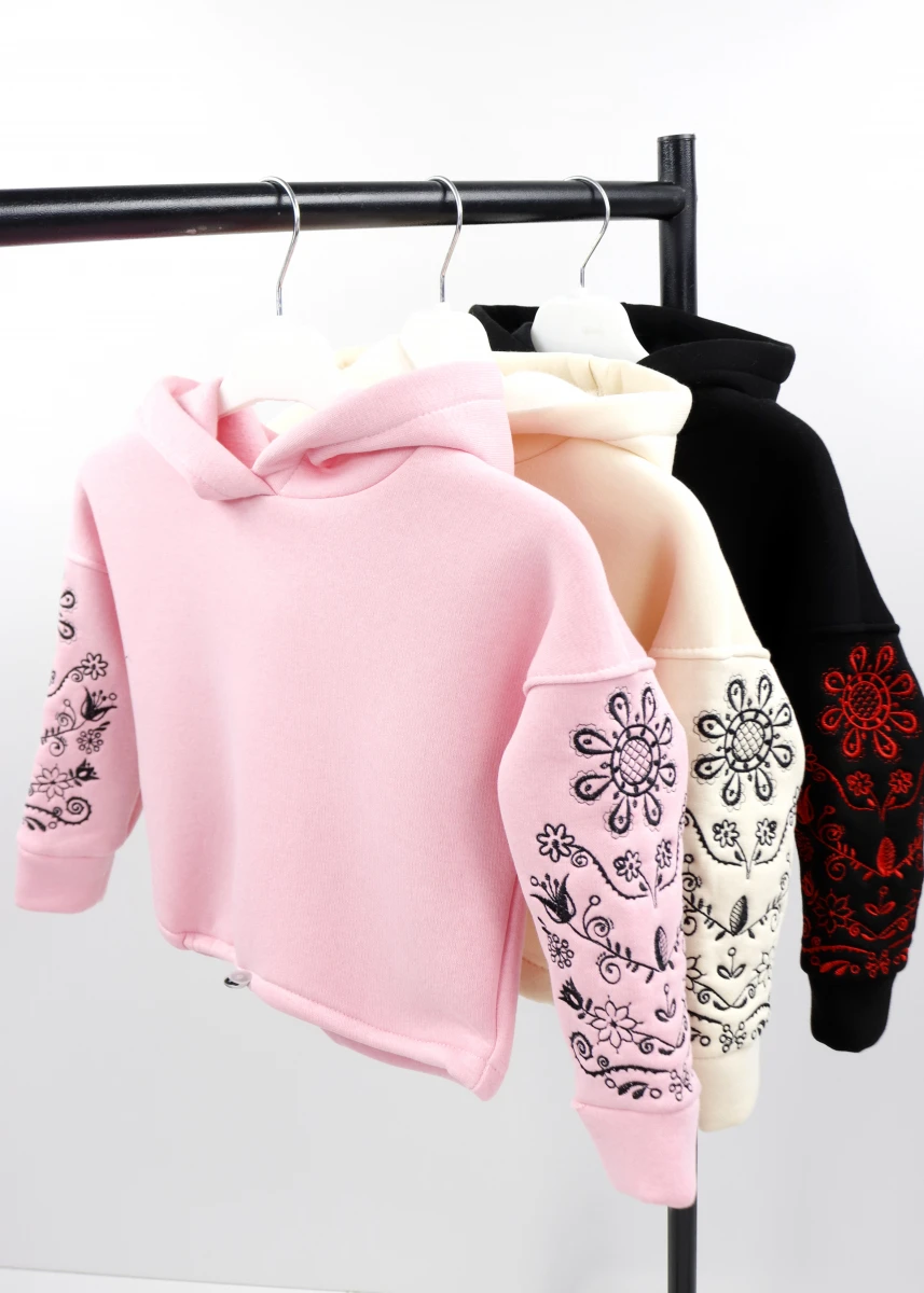 Производитель: Украина. Сезон: зима. Состав: 80% хлопок, 20% полиэстер. Однотонная. С капюшоном. Оверсайз. Рукава на манжете. Низ стягивается резинкой с фиксатором спереди. Рукава декорированы вышивкой.
