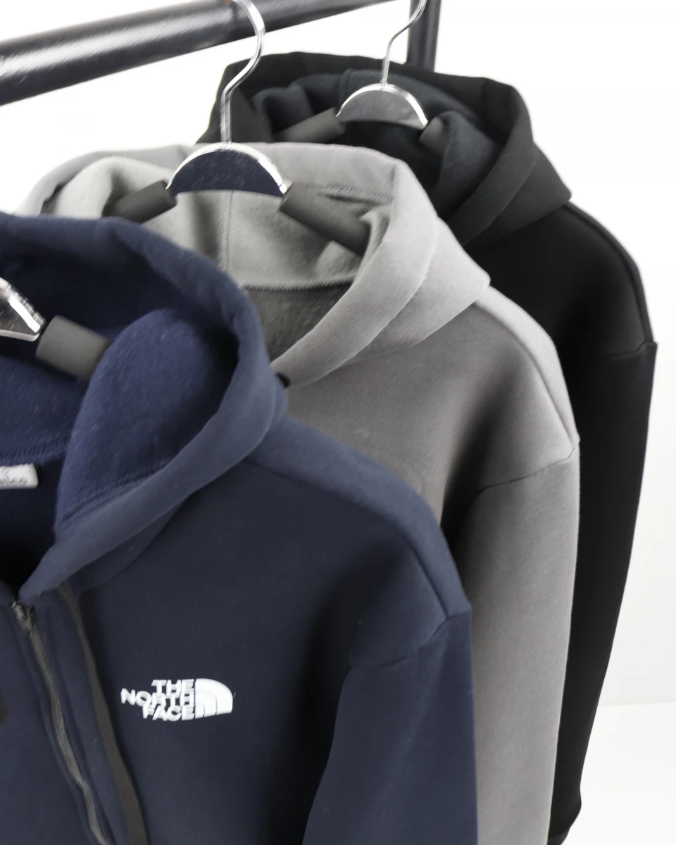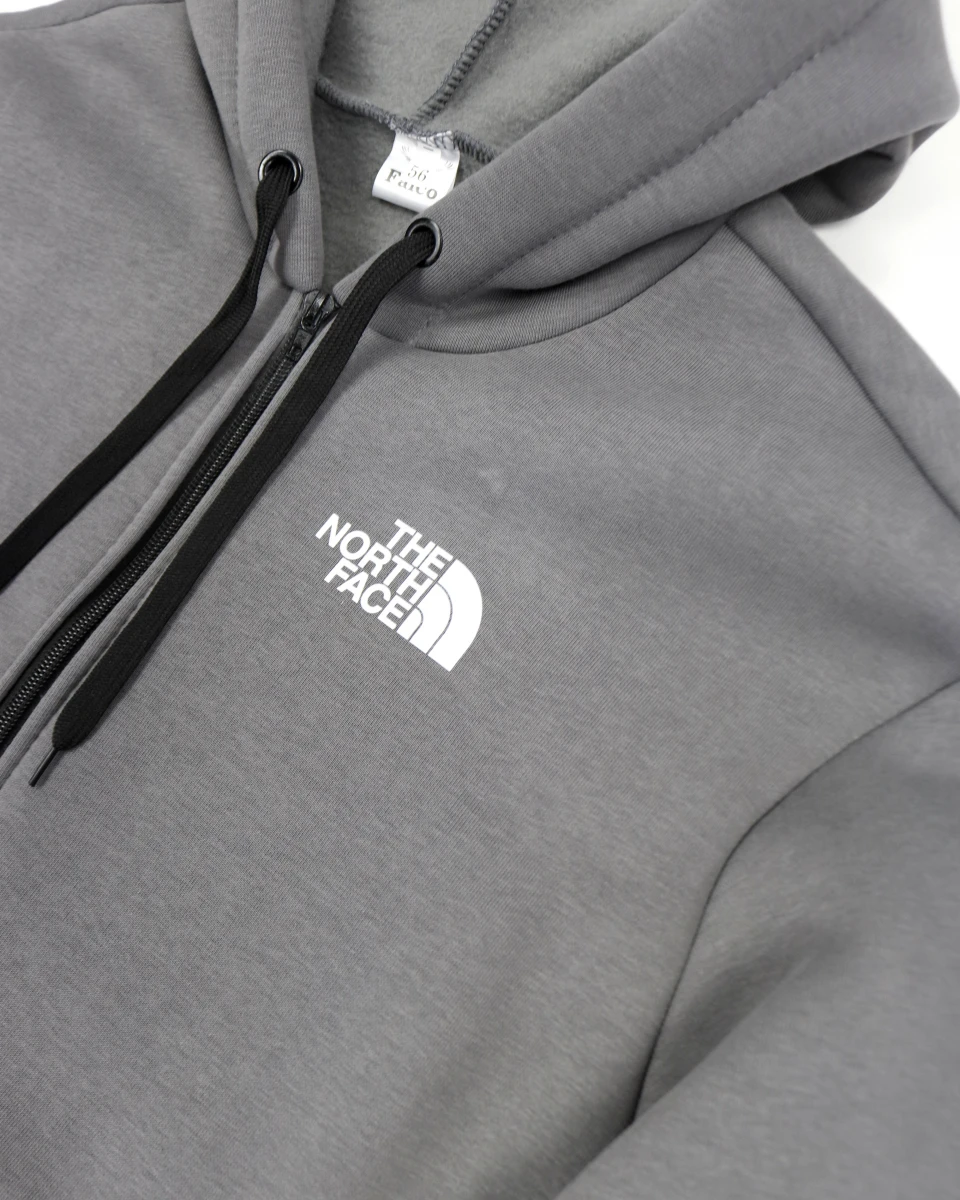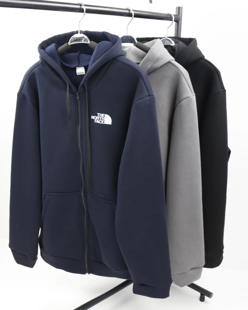Производитель: Украина. Сезон:зима. Состав: 75% хлопок, 20% полиэстер, 5% элестан. Кофта с капюшоном и шнуровками. На молнии. Рукава и низ на манжете. Карманы кенгуру. На груди слева надпись THE NORTH FACE.