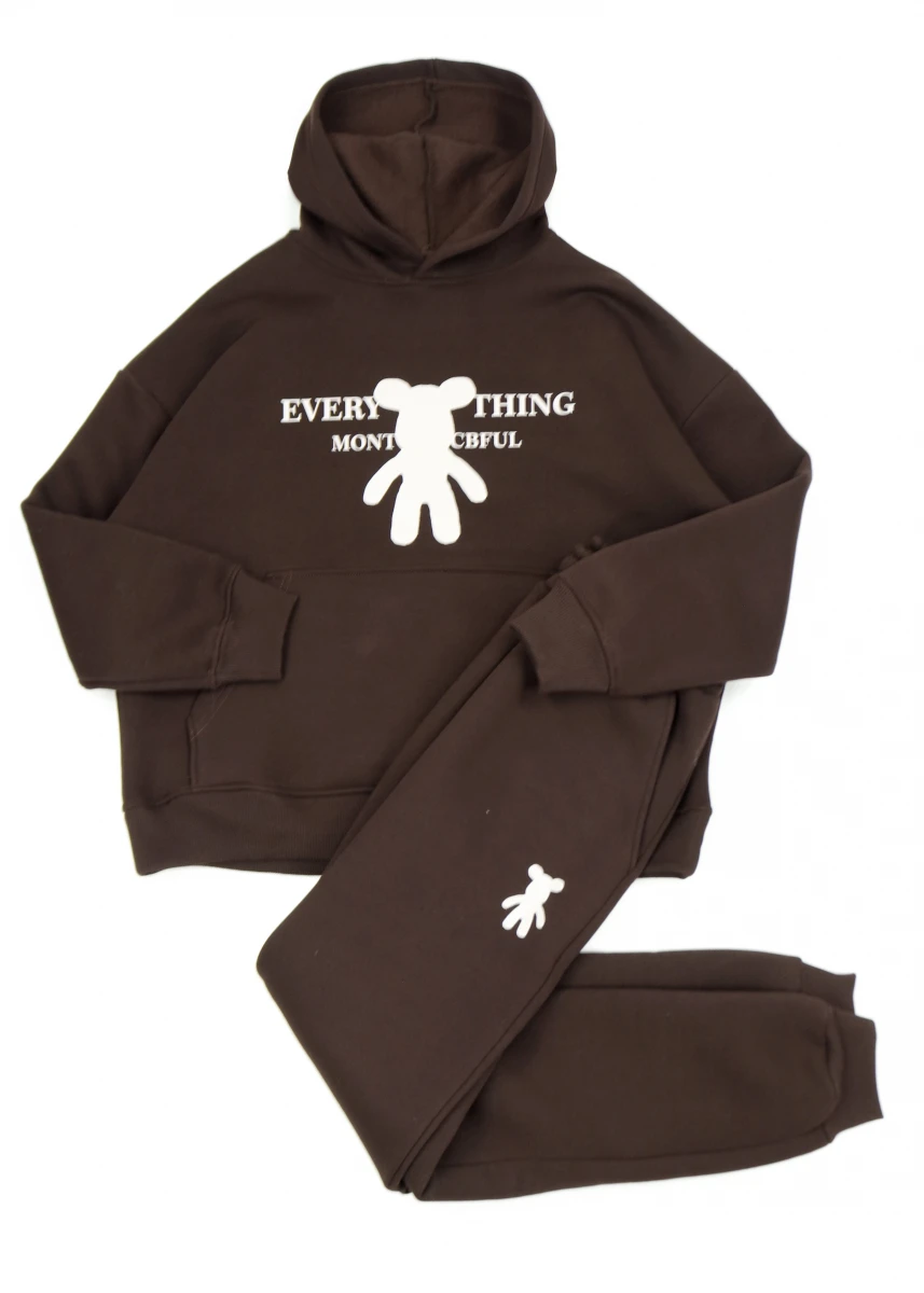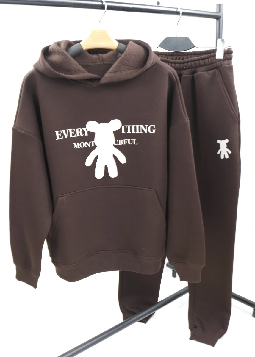 Производитель: Украина. Сезон:зима.Толстовка+штаны. Толстовка имеет капюшон, рукава и низ на манжете, спереди карман кенгуру, мишка, надпись. Брюки: пояс на резинке. Два косых кармана. Низ на манжете. С левой стороны мишка.