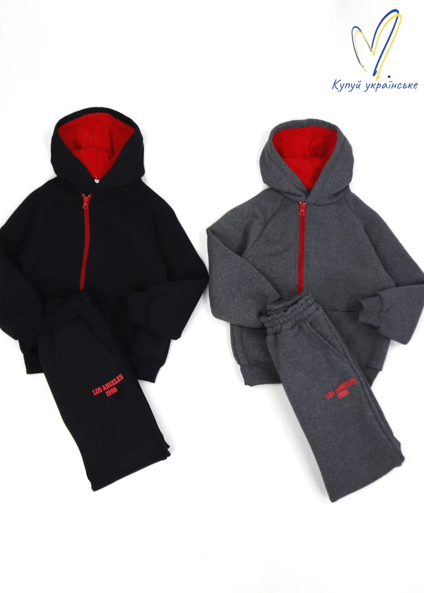 Производитель: Украина. Сезон: зима. Состав: 95% хлопок, 5% эластан. Однотонный. На флисе. Толстовка+штаны. Толстовка: с капюшоном. С правой стороны на молнии до середины. Молния скрывает надпись "LOSANGELES". Рукава и низ на манжете. Брюки: пояс на резинке. Под левым карманом декорированы надписью. Два косых кармана. Низ на манжете.