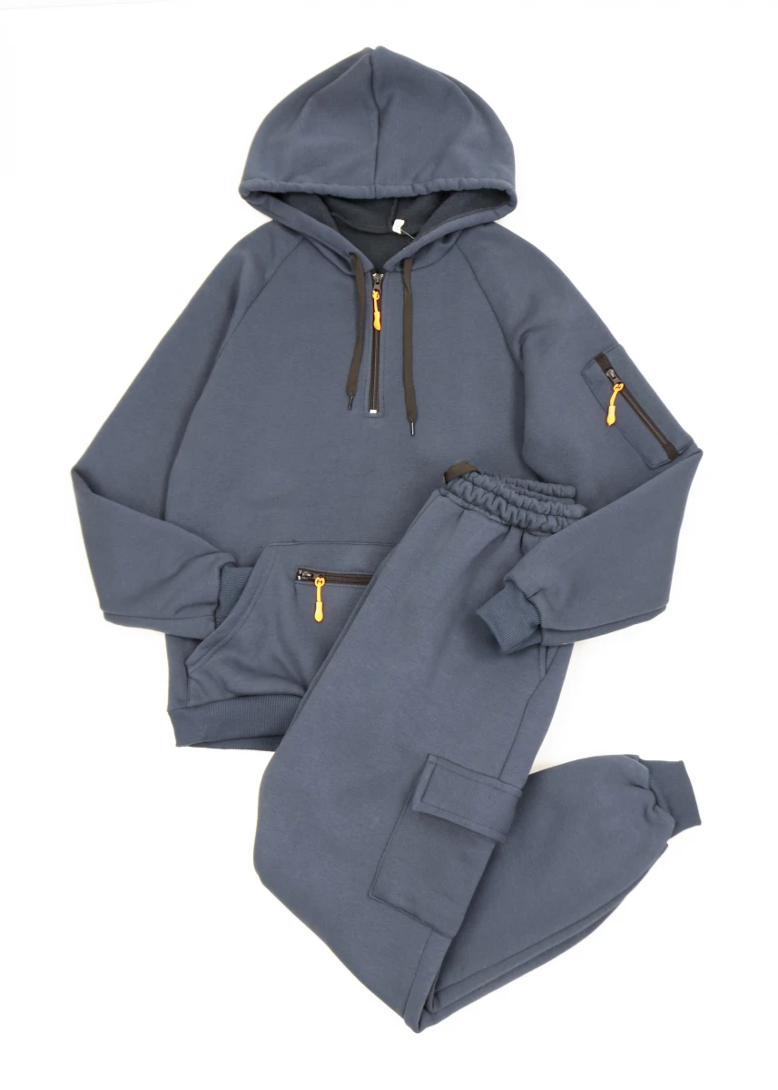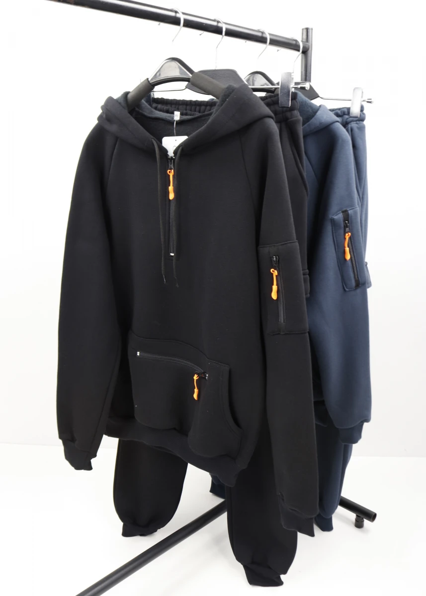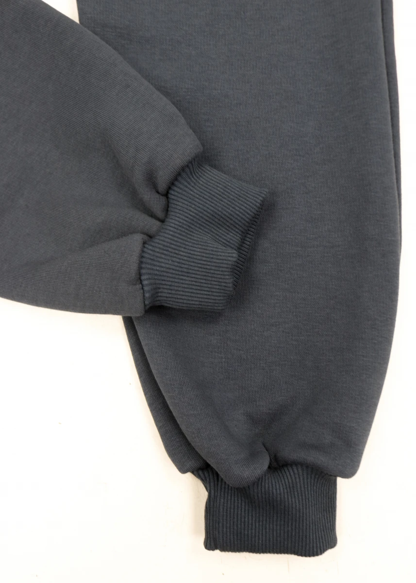 Производитель: Украина. Сезон: зима. Состав: 95% хлопок, 5% эластан. Однотонный. Брюки + кофта. На флисе. Кофта с капюшоном на шнуровке, молния к груди. Карман кенгуру декорирован молнией. Брюки: пояс на резинке со шнуровкой. Кармана два косых и нашивные с накидным верхом. Низ манжет.