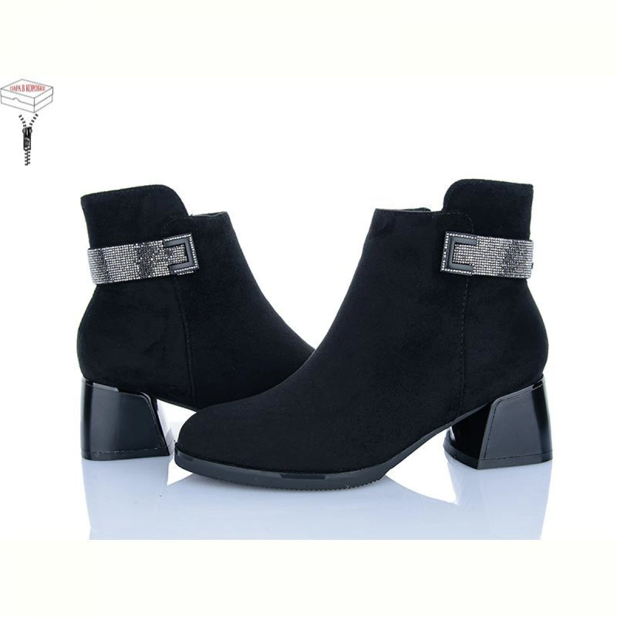 Производитель Китай. Сезон деми. Материал верха искусственный замш. Материал подкладки и стельки утепленный текстиль. Модель на среднем широком каблуке. Ботинки на застежке молнии, украшенные декоративным элементом.