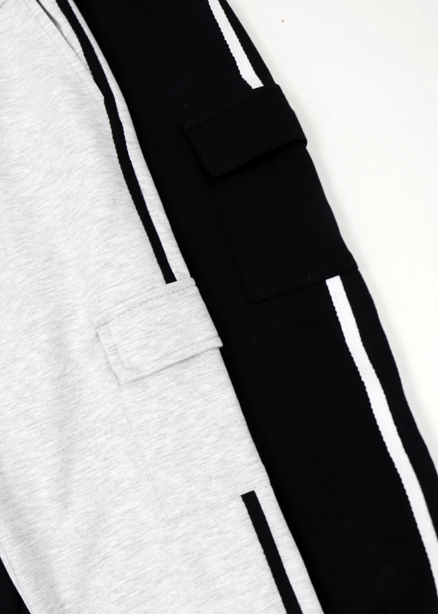 Производитель: Украина. Сезон: деми. Состав: 95% хлопок, 5% эластан. Однотонные. Пояс на резинке. Два костных кармана и по бокам нашивные карманы с накидным верхом. Низ колосьев на манжете. По длине колошней подшиты полоски другого цвета.