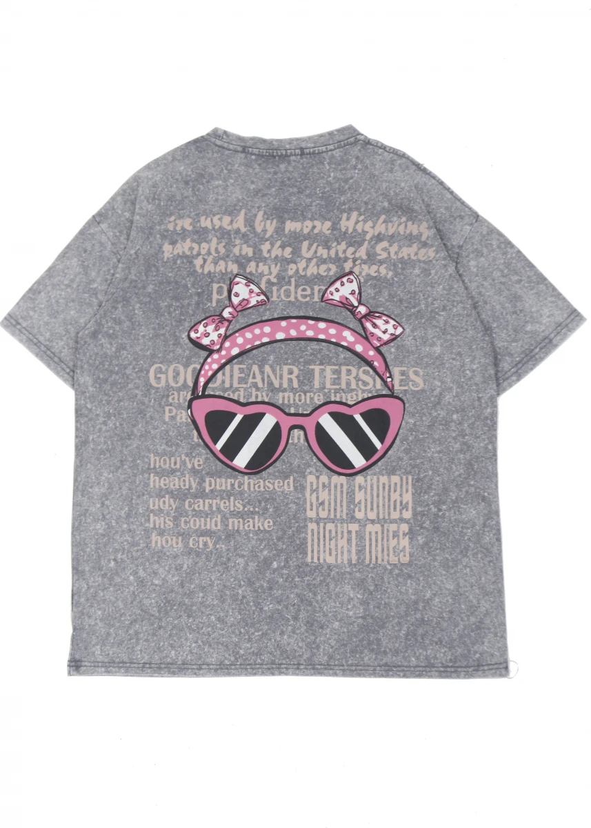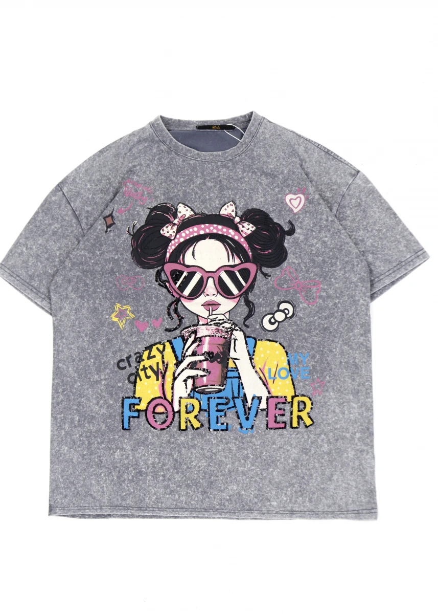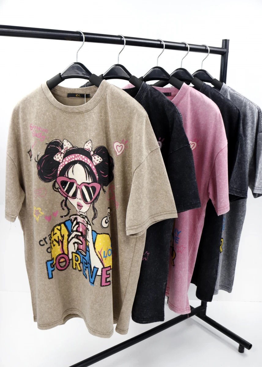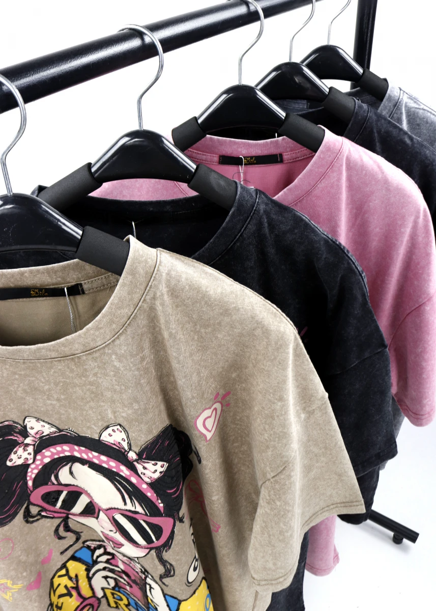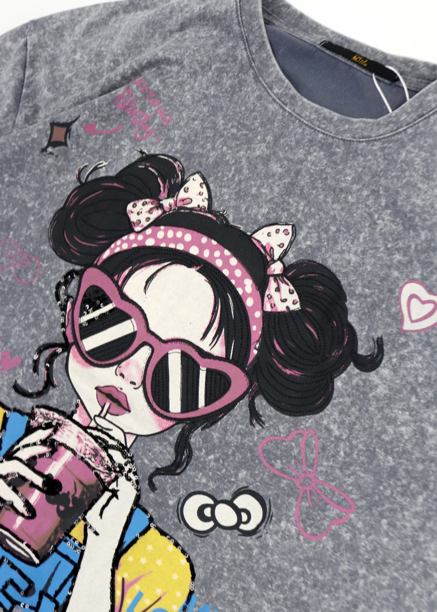 Производитель: Китай. Сезон: лето. Состав: 95% хлопок, 5% спандекс. Однотонная, вареная. Оверсайз. Круглая горловина. Спереди декорирована изображением девушки с надписью частично из пайеток. Сзади декорирована разными надписями.