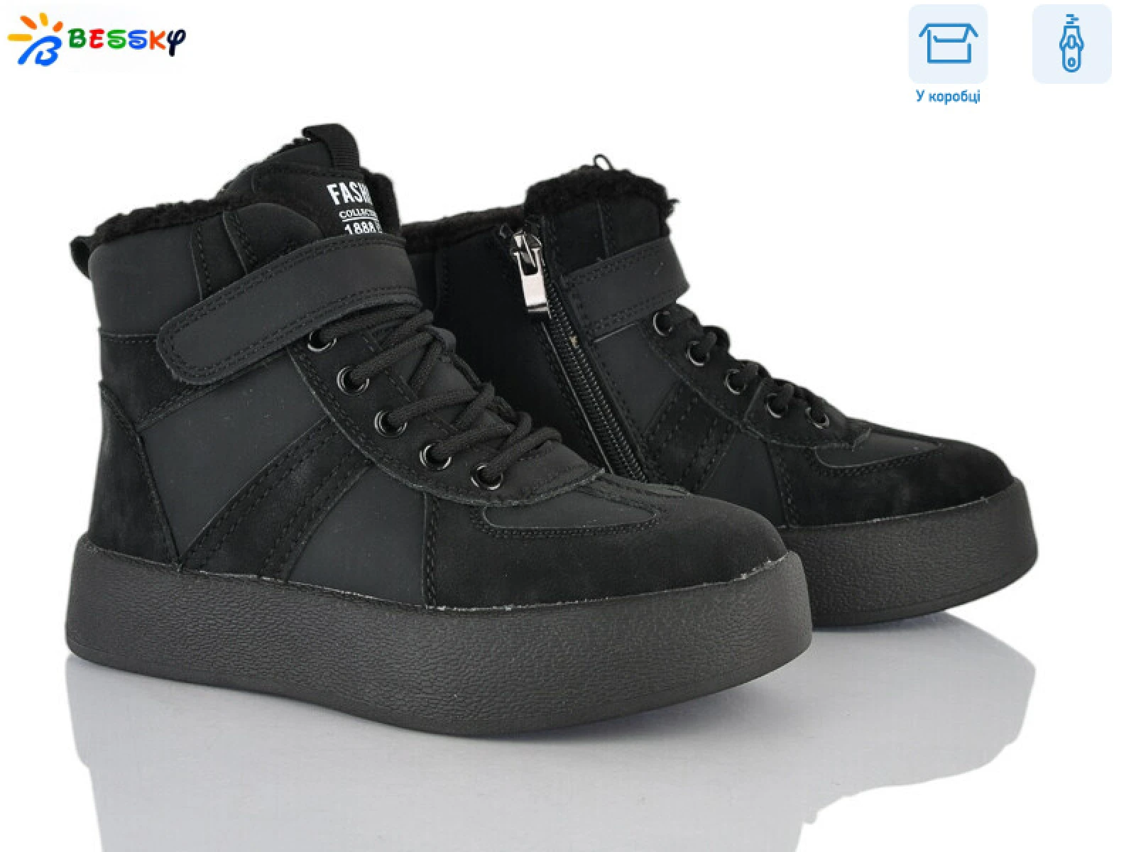 Виробник Китай. Сезон зима. Матеріал верху екошкіа. Матеріал підкладки штучне хутро. Матеріал устілки штучне хутро. ПВХ підошва. Модель на застібці блискавці, застібці липучці та фальш шнурівці.