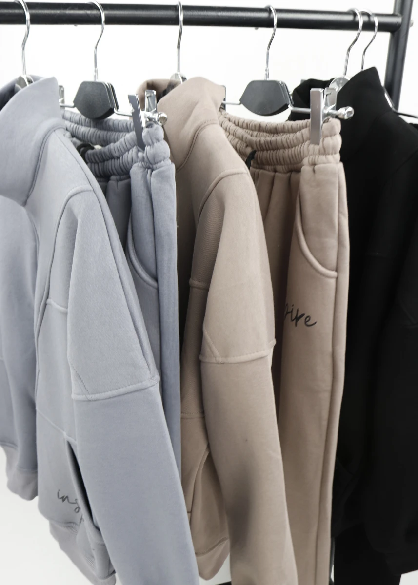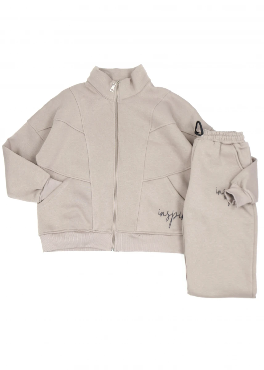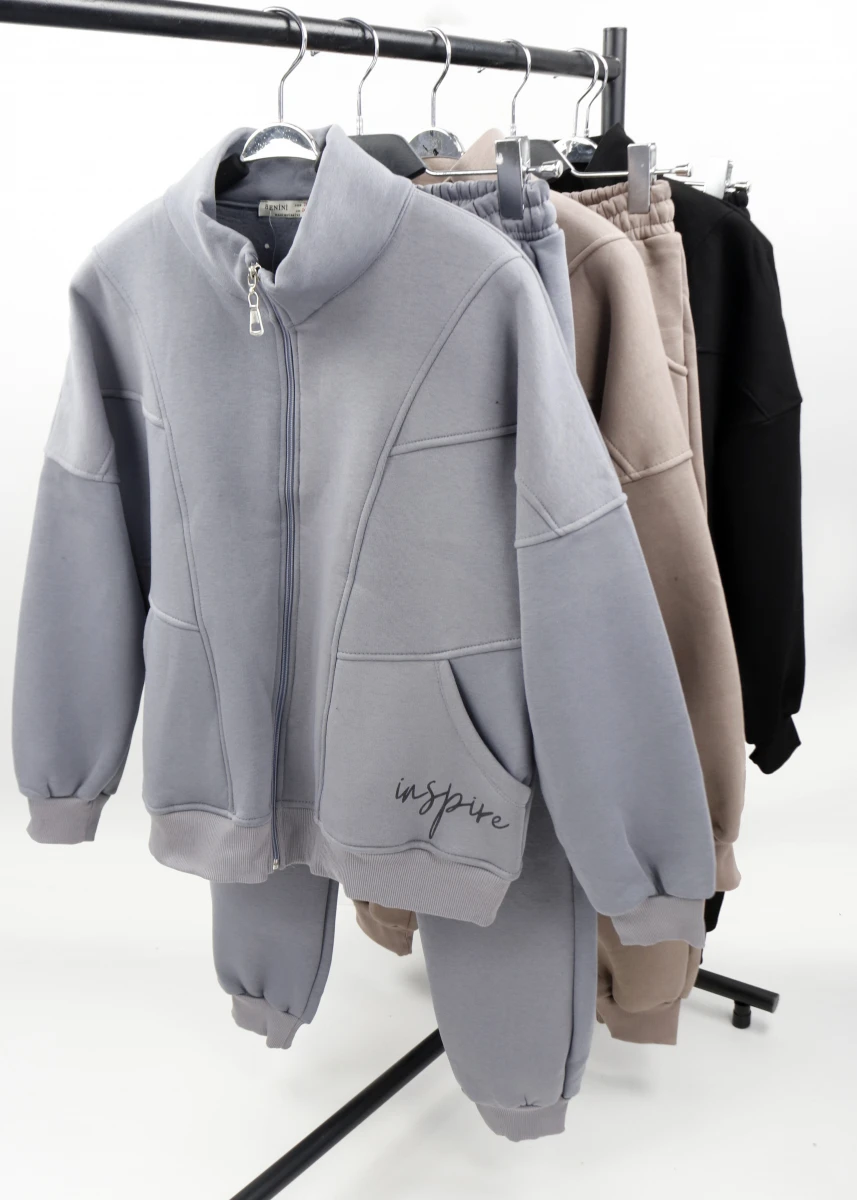 Виробник Туреччина. Сезон зима. Склад: 95% котон, 5% еластан. Кофта+штани. Кофта застібається на блискавку, кишені, злівої сторони напис, рукава та низ на манжеті. Штани на резинці+шнурівка, низ на манжеті. Косі кишені.