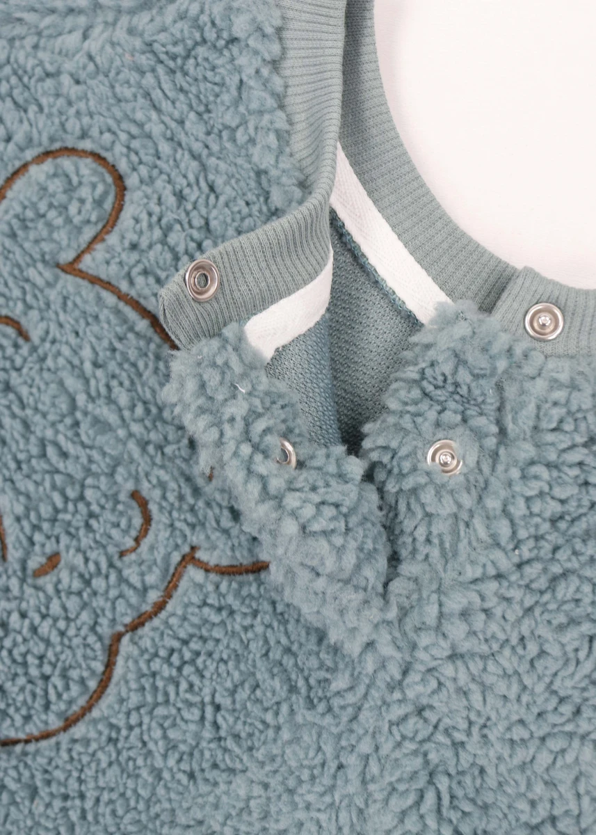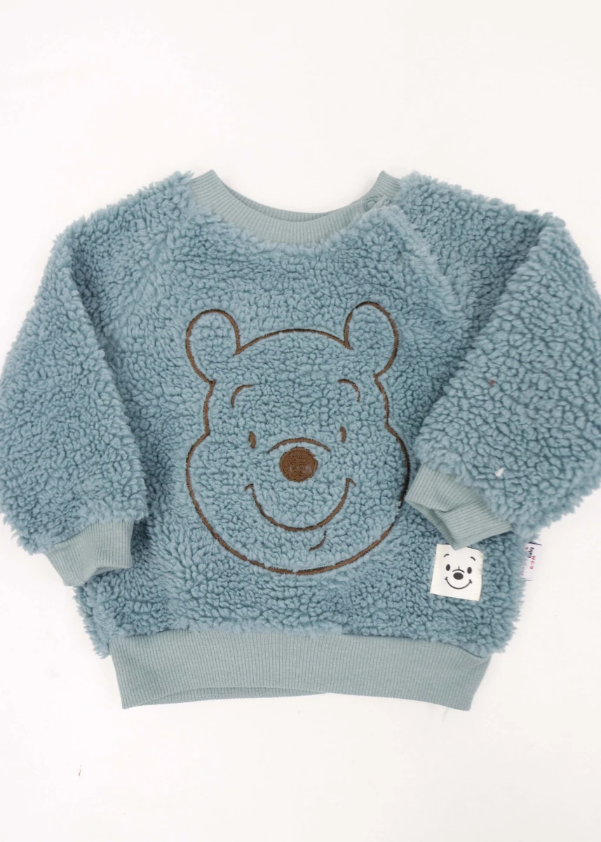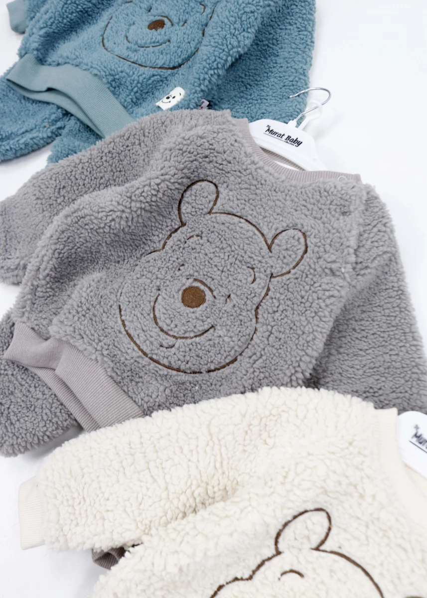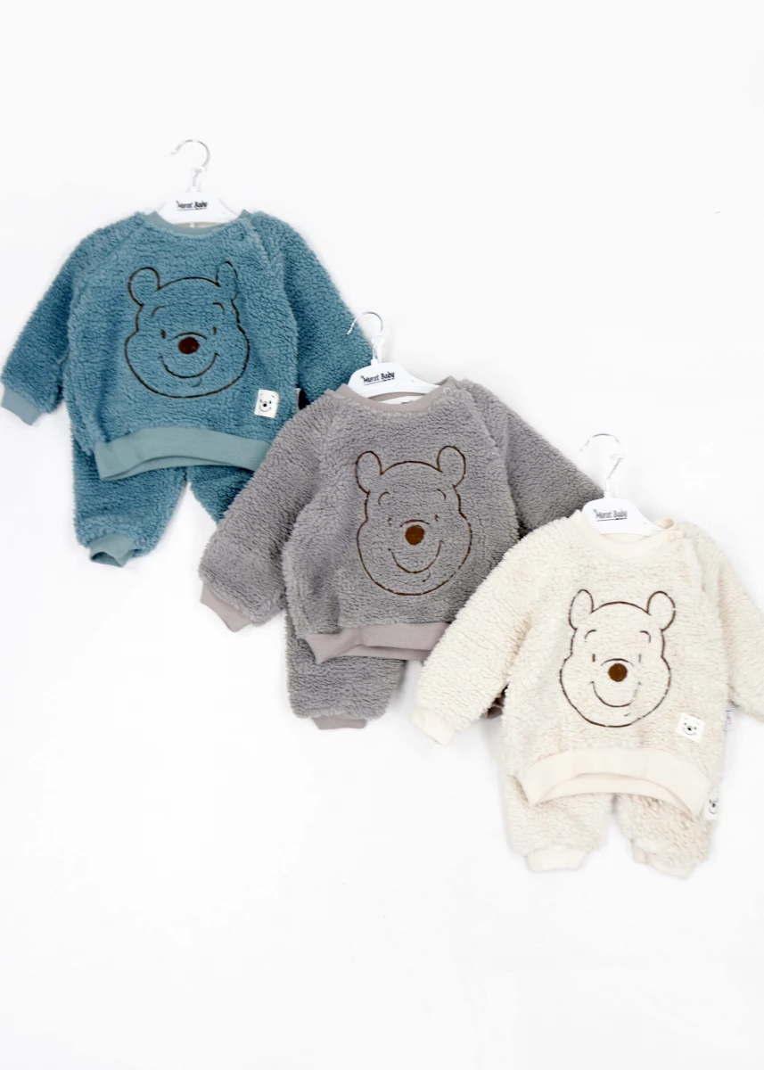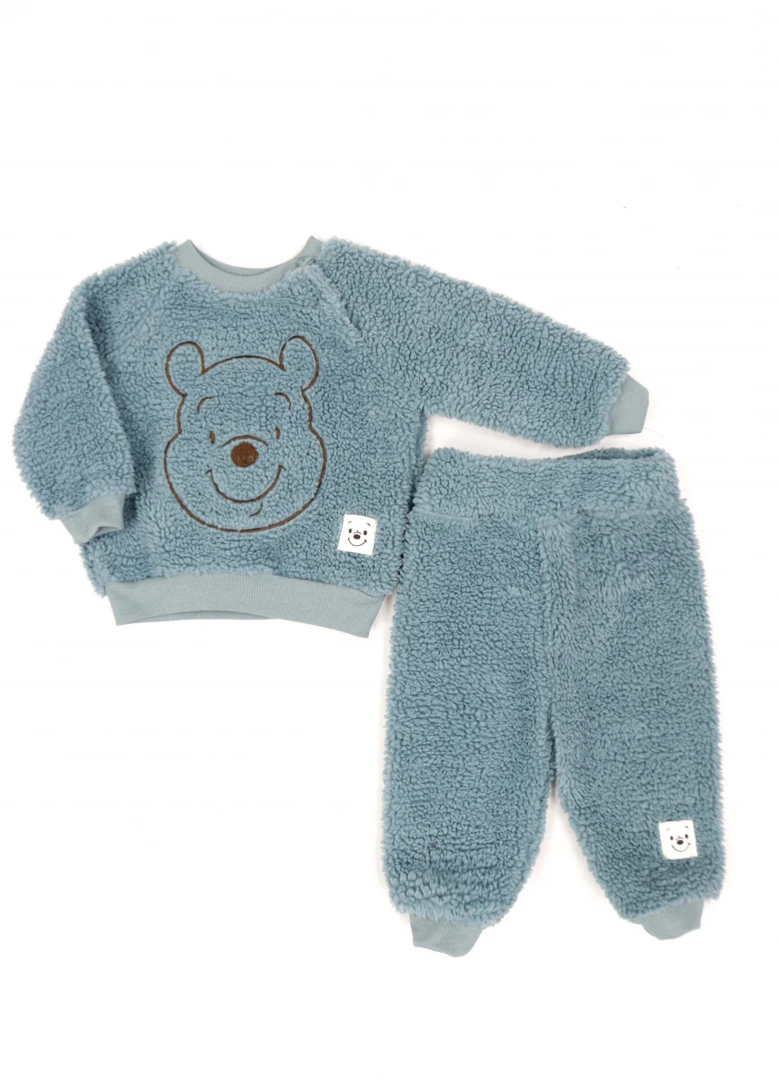 Виробник: Туреччина. Сезон: зима. Склад: 100% бавовна. Костюм. Однотонний. Світшот+штани. Світшот: кругла горловина. Рукава та низ на манжеті. Горловина ліворуч на кнопці. Спереду декорована вишитим зображенням Вінні-Пуха та знизу нашивкою. Штани: пояс на резинці. Низ на магжеті.
