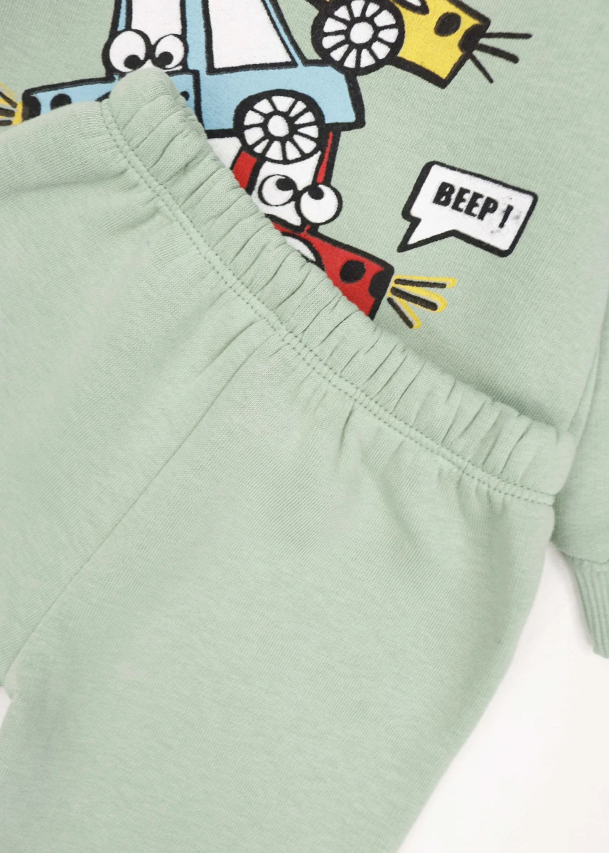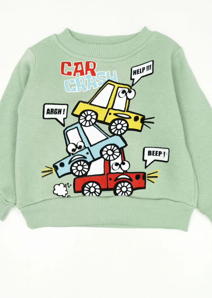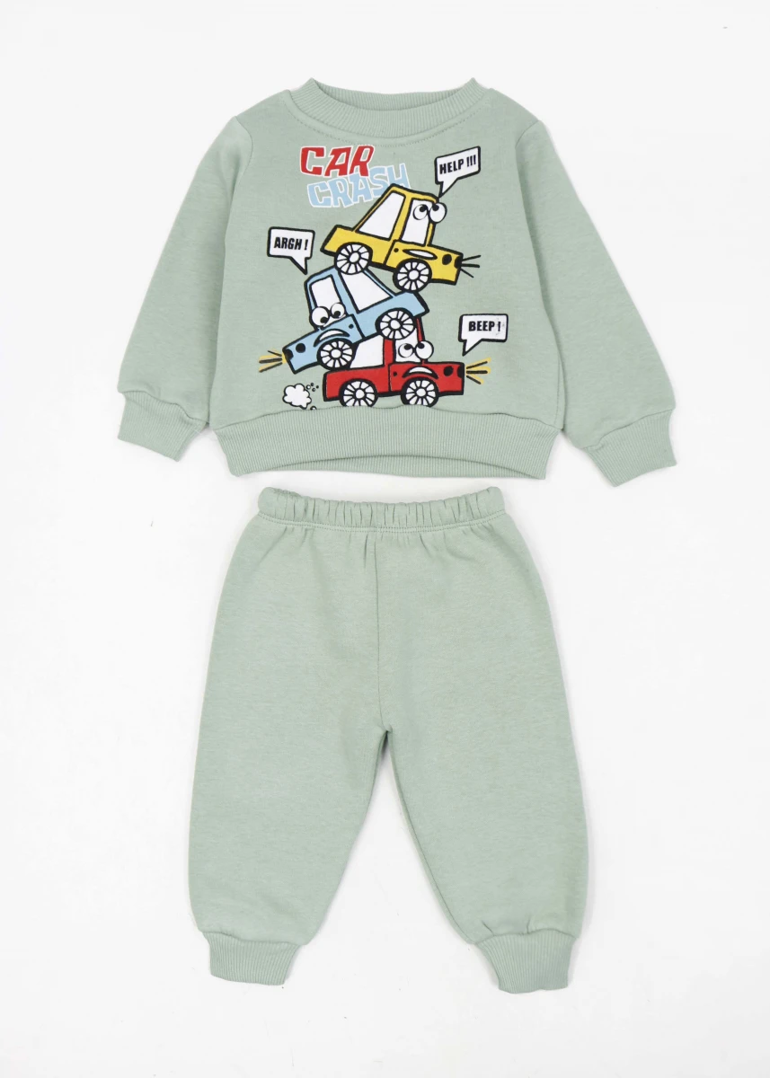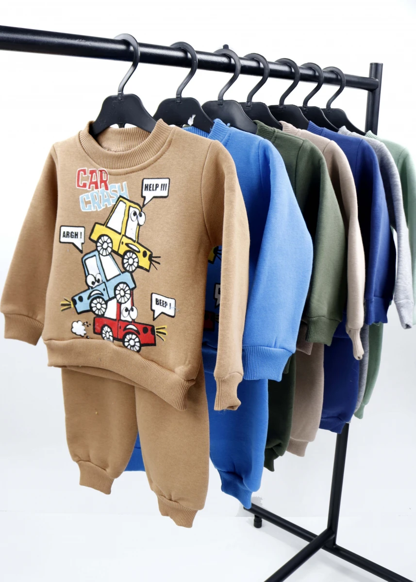 Виробник: Туреччина. Сезон: зима. Склад: 85% бавовна, 15% поліестер. Однотонний.На флісі. Кофта+штани + брилки попіт. Кофта: світшот. Кругла горловина. Рукава, низ та горловина на манжеті. Спереду декорований написом CAR CRASH зображенням 3-х автівок . Штани: пояс на резинці. Низ на манжеті.