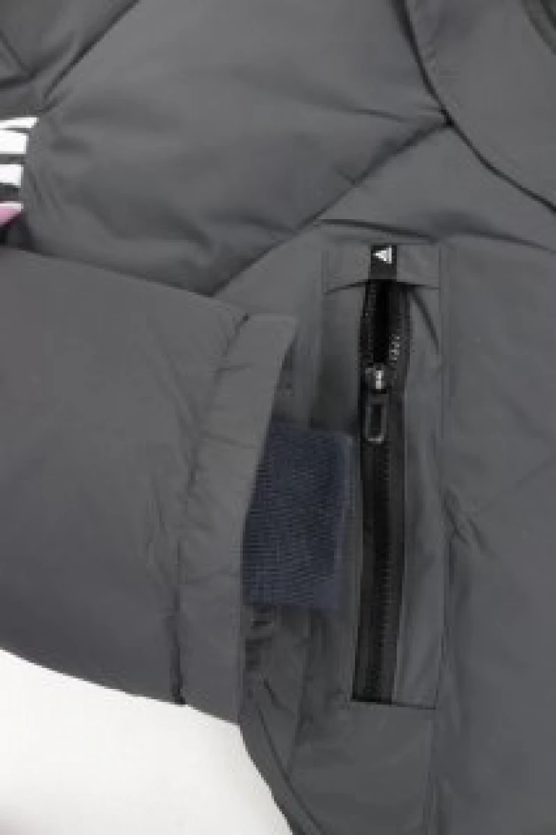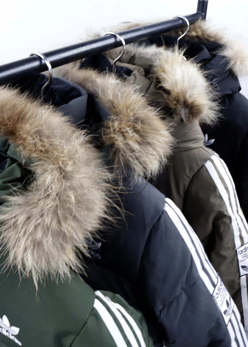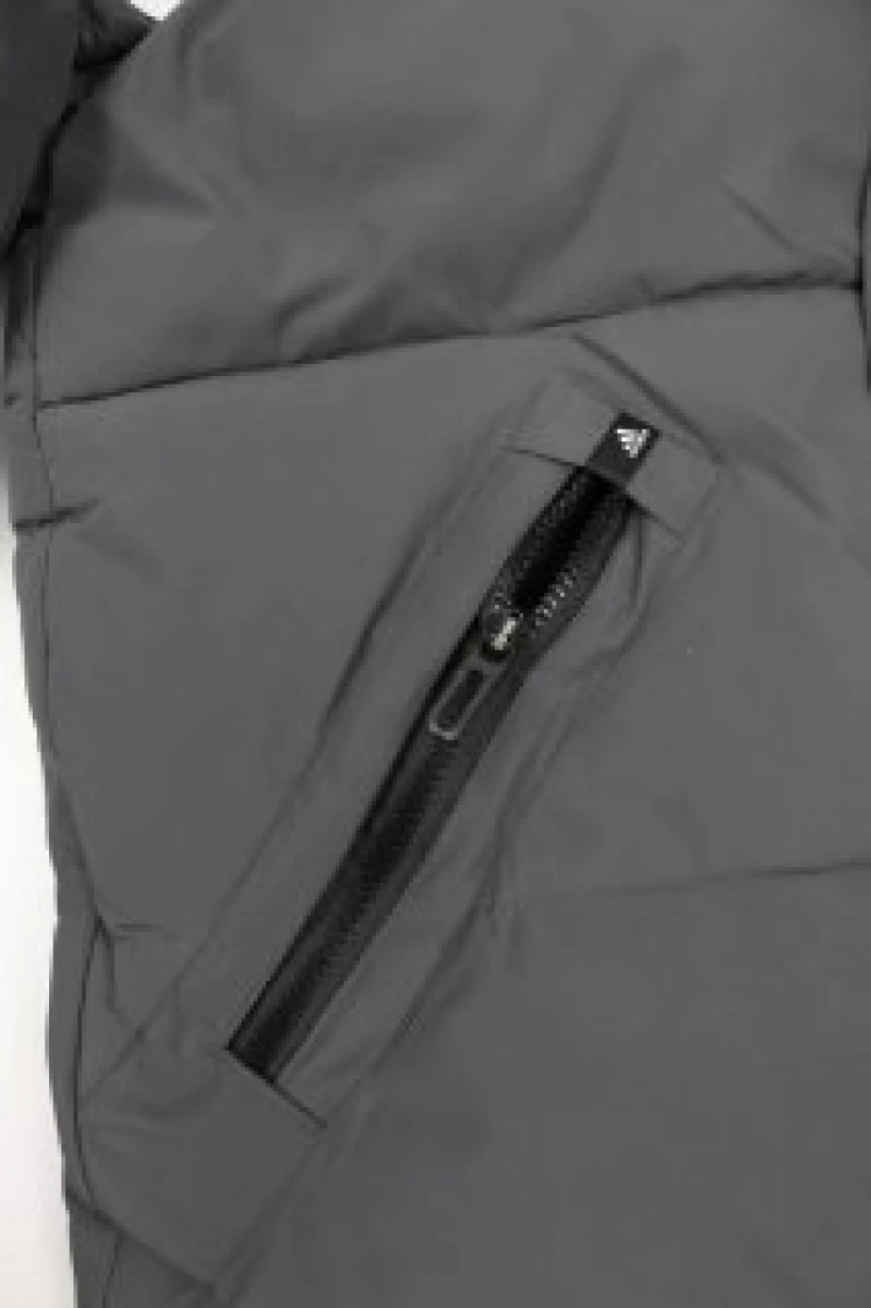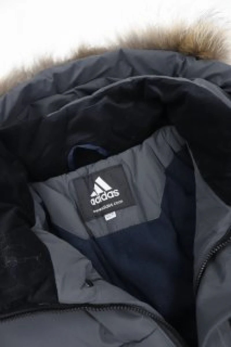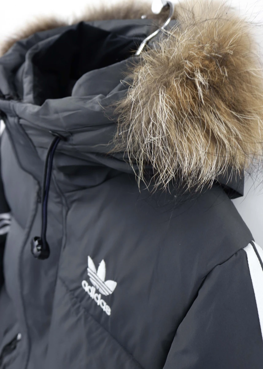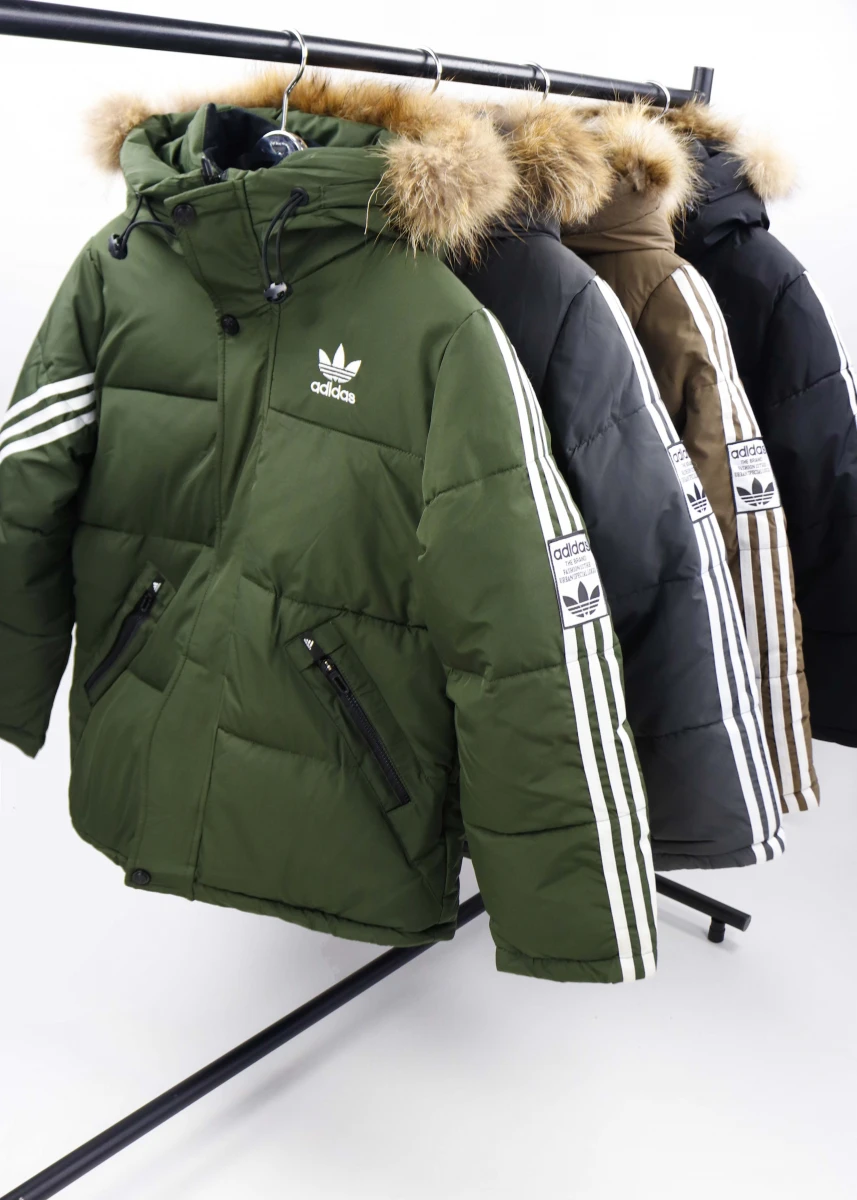 Виробник Китай. Сезон зима. Капюшон з хутром. З лівої сторони на грудях вишивка бренду "Adidas". На рукавах три білі полоси . Всередині куртки на спині флісова підкладка.