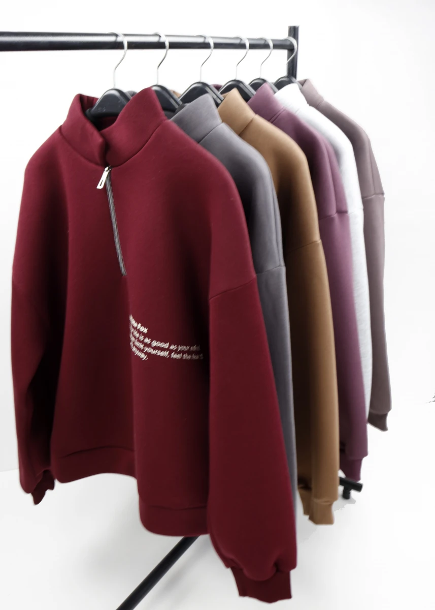 Виробник: Україна. Сезон: зима. Склад: 80% бавовна, 20% поліестер. На флісі. Однотонна. Оверсайз. Комір стієчка. До середини на блискавці. Рукава та низ на манжеті. Спереду декорована написом.