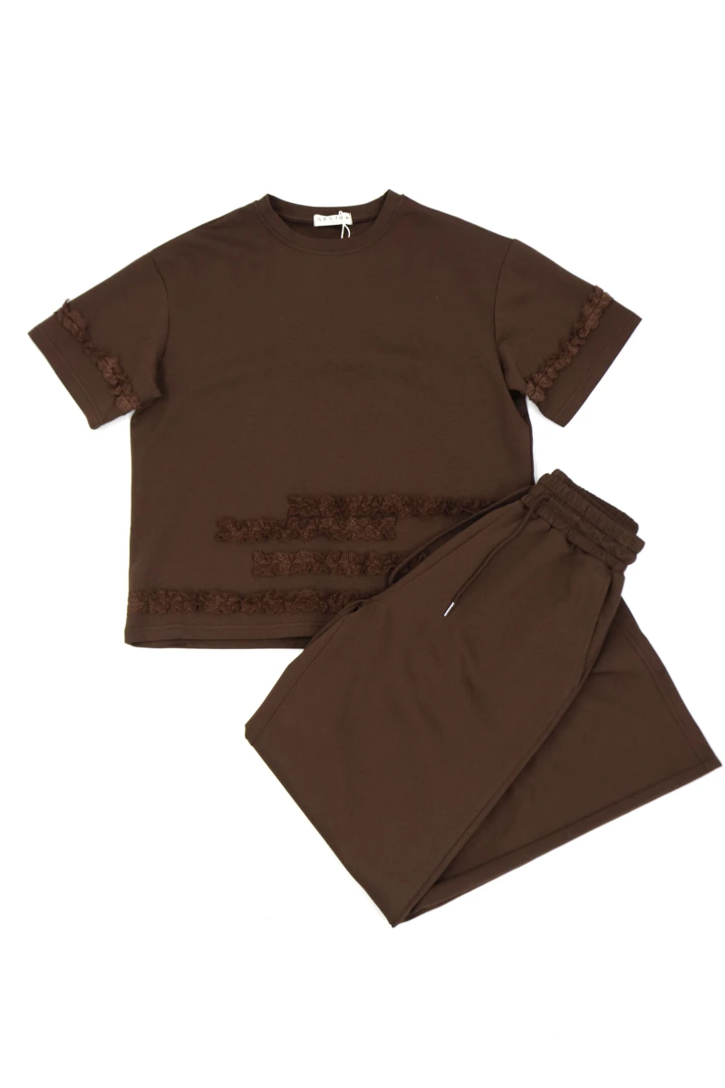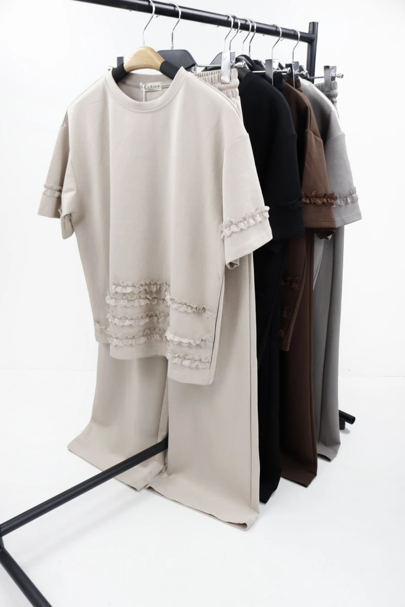 Виробник: Китай. Сезон:літо. Склад:95%бавовна, 5%поліестер. Однотонний. Футболка: спереду та на рукавах вшите мереживо. Штани: широкі, прямі, пояс резинка+шнурівка, скісні кишені.