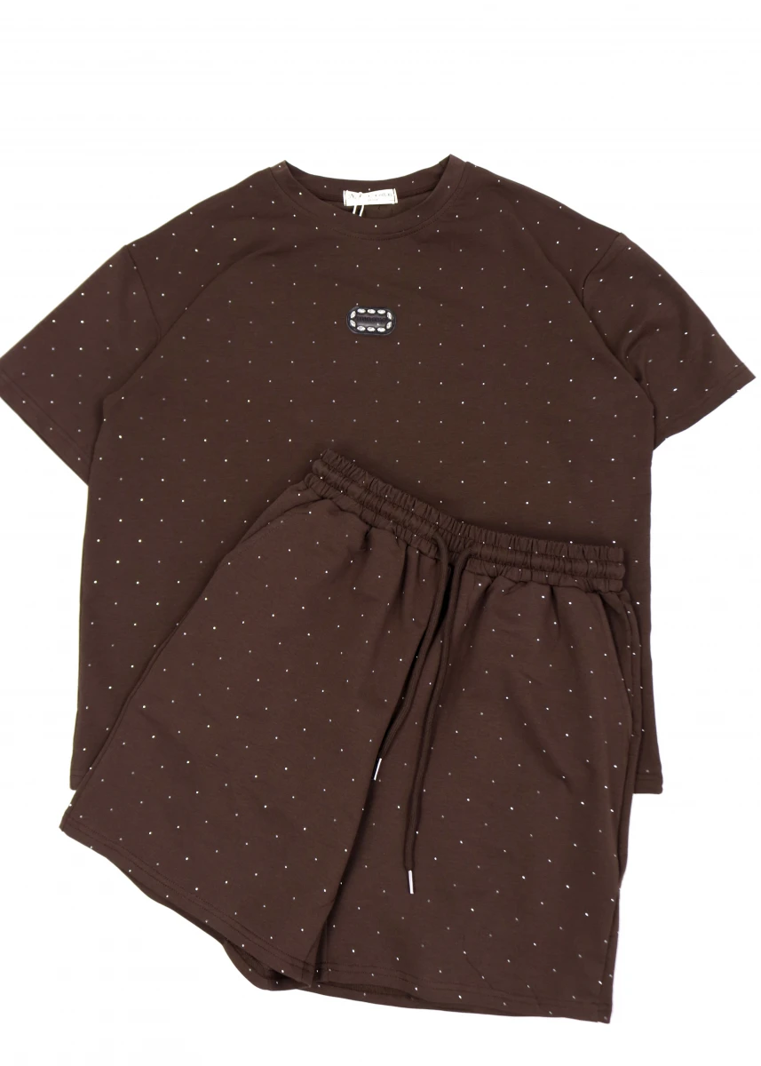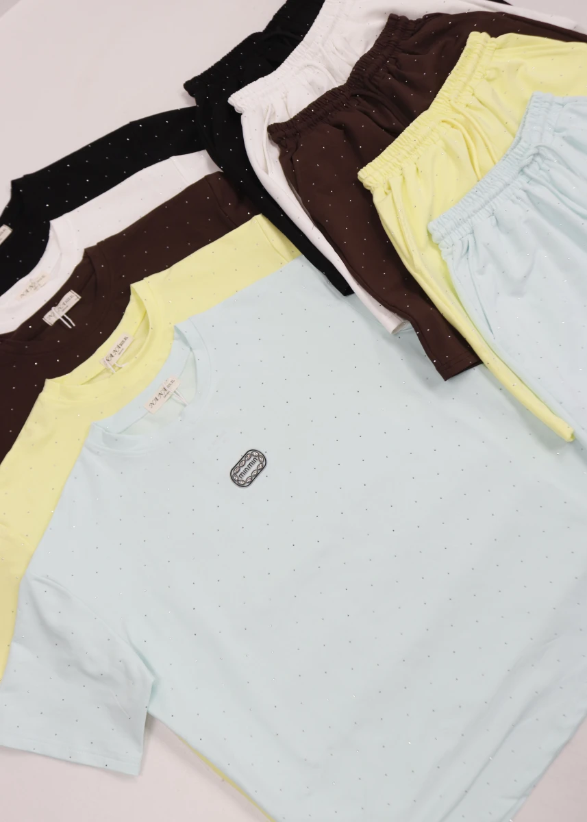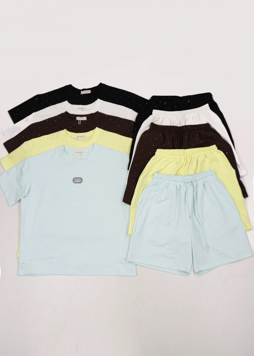 Виробник: Китай. Сезон:літо. Склад:95%бавовна, 5%поліестер. Футболка та шорти однотонні, в камінчики. Футболка: кругла горловина, спереду прорезинова нашивка. Шорти: пояс резинка+шнурівка, скісні кишені.